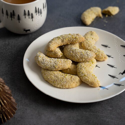 Pistazien-Kipferl mit feinem Aroma und zartem Schmelz – ein Genuss, der auf keinem Plätzchenteller fehlen darf. Perfekt zum Verschenken oder zum Selbstnaschen bei einer Tasse Tee.