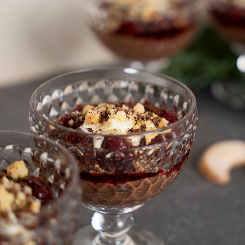 Cremig, schokoladig, weihnachtlich! Dieses Dessert ist blitzschnell gemacht und sorgt mit seinem samtigen Schokomousse und den aromatischen Gewürz-Kirschen für pure Weihnachtsstimmung im Glas.