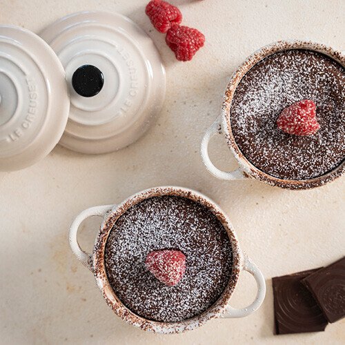 Kleiner, großartiger Genuss! Der Schokokuchen mit flüssigem Kern schmeckt nicht nur sündhaft lecker, sondern sieht in den kleinen, ikonischen Mini-Cocottes besonders niedlich aus.