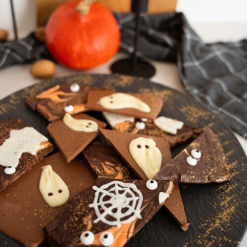 Diese Halloween Schokolade ist schnell gemacht und sorgt garantiert für den Wow-Effekt auf jeder Party. Ob süße Geister, Spinnennetze oder kleine Fledermäuse. Gruselig lecker!