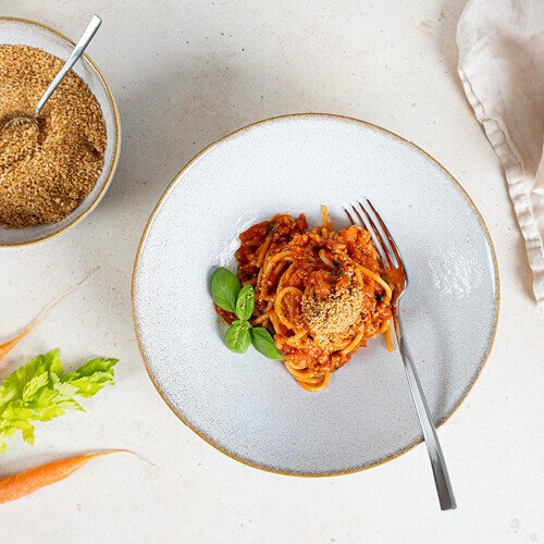 Mit Sojagranulat statt Fleisch, würziger Tomatensauce und frischem Gemüse ist diese Bolognesesauce eine köstliche, pflanzliche Alternative. Das Topping: veganer Parmesan!