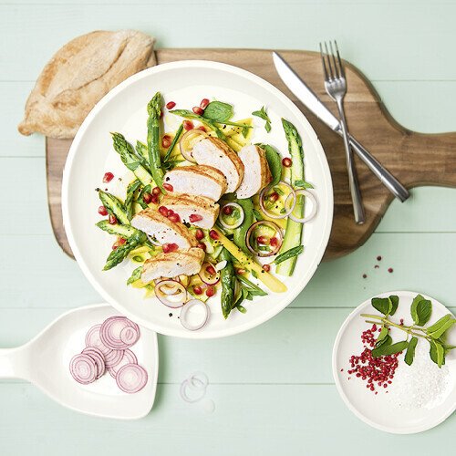 Probieren Sie mal diese knackig-frische Salatvariante mit grünem Spargel und süßen Erdbeeren, die auf dem Teller auch noch ungeheuer gut aussieht.