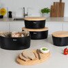 Der praktische Brottopf von Continenta aus schwarzer Keramik passt mit seinem hellen Holzdeckel in jede Küche. Das Brot bleibt darin lange frisch; dafür sorgen die seitlichen Belüftungslöcher. Die Rückseite des Deckels ist nicht nur zum Verschließen des Topfes gedacht, sie hat noch eine zweite Funktion und dient als Brotschneidebrett.