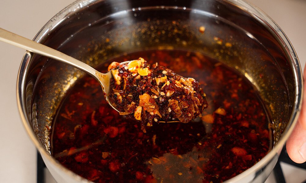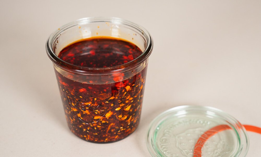 Zuletzt noch die Soja- und Austernsoße sowie den Honig einrühren. Das Öl am besten ganz auskühlen lassen und falls nötig mit Salz und Chili nachschmecken.