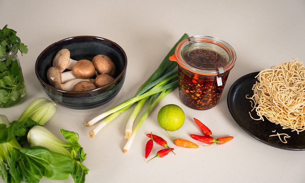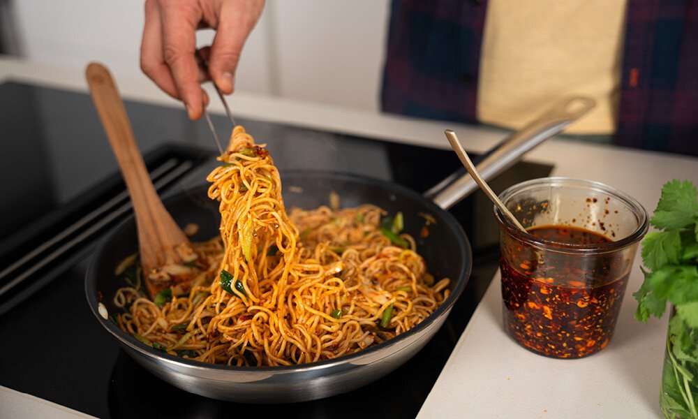 Die Nudeln nach Anleitung kochen. Zum Gemüse in die Pfanne geben und mit 2 bis 3 EL vom vorbereiteten Chili-Crunch-Öl vermischen. Mit Sojasoße abschmecken und mit etwas frischem Koriander servieren.
