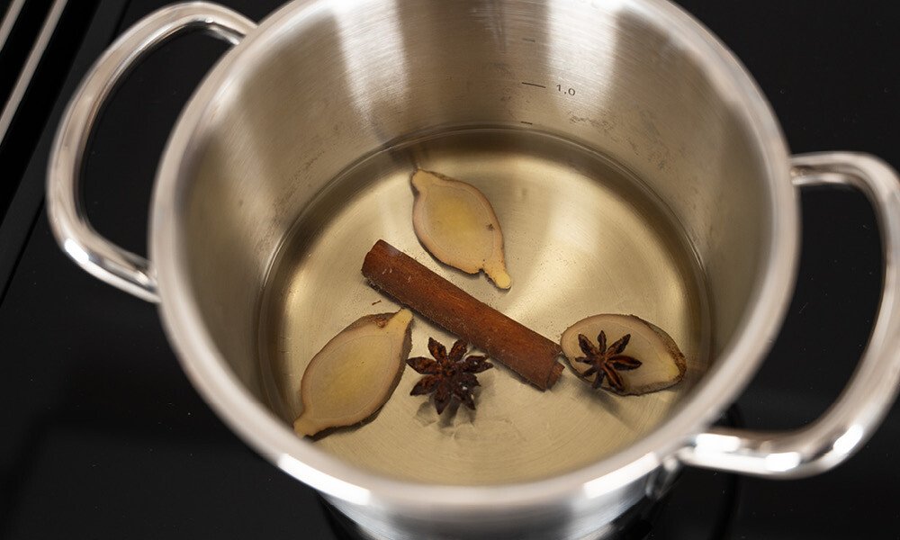Das Öl in einem Topf mit Zimt, Sternanis und Ingwer auf etwa 160 °C erhitzen.