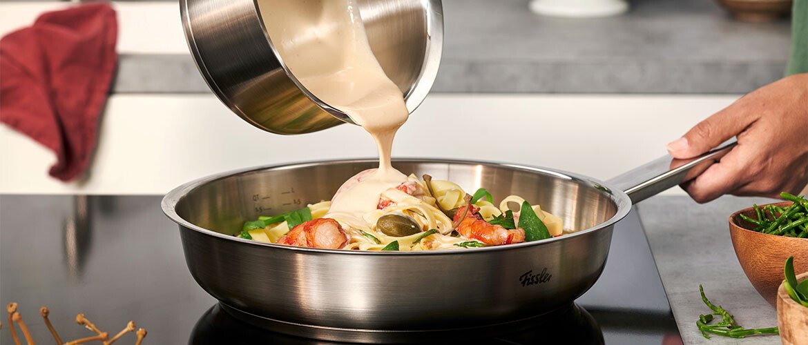 Die Pfannen aus der Original-Profi Collection® von Fissler begeistern mit ihren zahlreichen praktischen Features, wie der Innenskalierung und der Backofentauglichkeit. Sie eignen sich vor allem zum scharfen Anbraten von Fleisch, Krustentieren oder Gemüse.