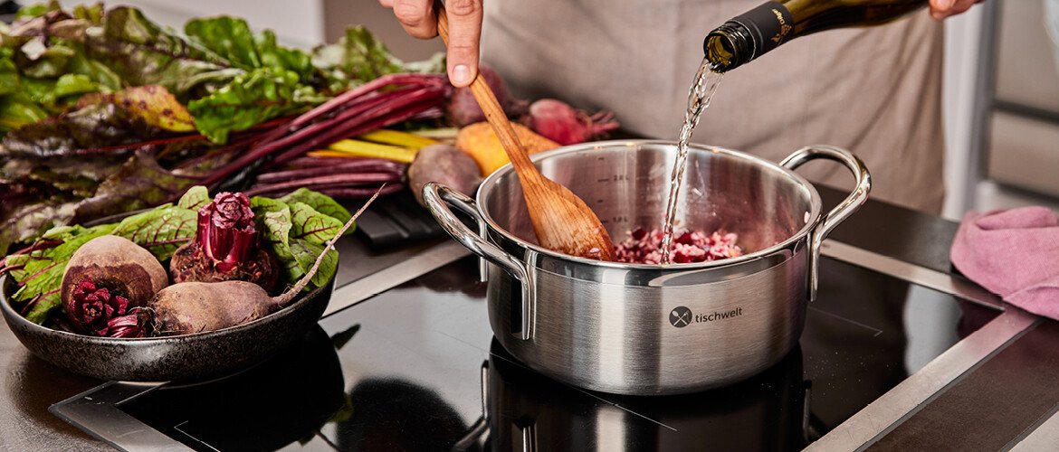 Unser tischwelt-Kochgeschirr ist für alle Herdarten geeignet: Induktion, Gas, Glaskeramik und Elektro. Zudem ist es backofenfest bis 220 °C. Die Töpfe dürfen in der Spülmaschine gereinigt werden, die Pfannen hingegen aufgrund ihrer Beschichtung von Hand. Das Cook Love Kochgeschirr hat eine 10-Jahregarantie.