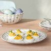 Der Eierteller Easter Delight von Villeroy & Boch trumpft mit seiner dekorativen Gestaltung auf. Mit seinem sanften Grün, seiner geschwungenen Blütenform und den vielfältig gestreuten Spielzeug- und Ostermotiven setzt er Ihre Deko- und Frühstückseier mit einer frühlingshaften Note in Szene. Die sechs Vertiefungen sind gleichmäßig geformt, wodurch Sie Ihre Eier ansprechend drapieren können. Nutzen Sie dieses hübsch gestaltete Geschirrstück als Eyecatcher auf Ihrer Ostertafel.